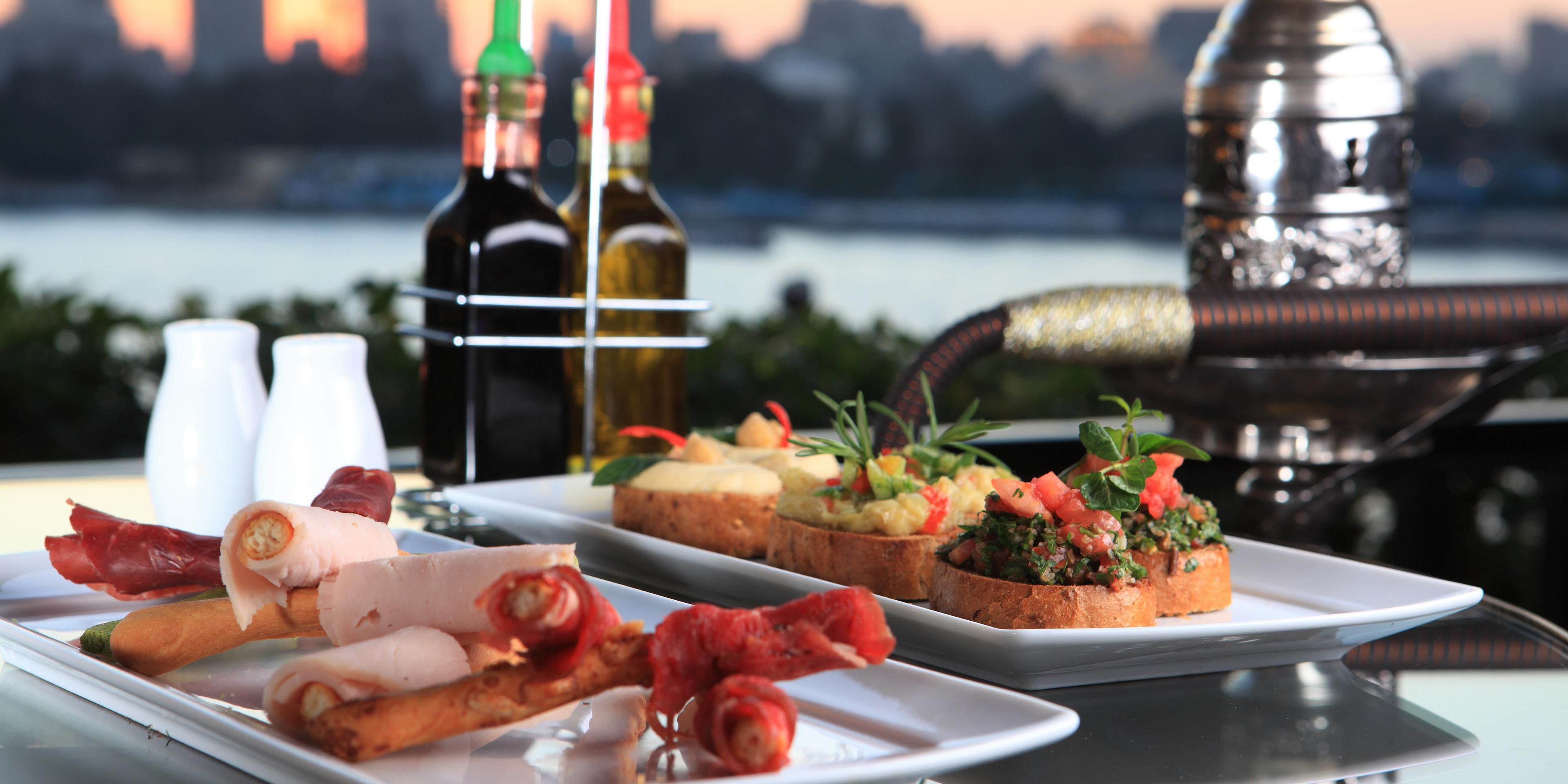 With the Nile as your backdrop, the scene is set for the ultimate "en plein air" experience. Sit back and enjoy blended drinks, pastries, paninies, appetizers, mezzah and aromatic Shisha selections, whilst capturing exciting sporting events on the big screen. Enjoy a unique dining experience that is truly memorable. The Nile Terrace is open for lunch on Fridays and Saturdays.